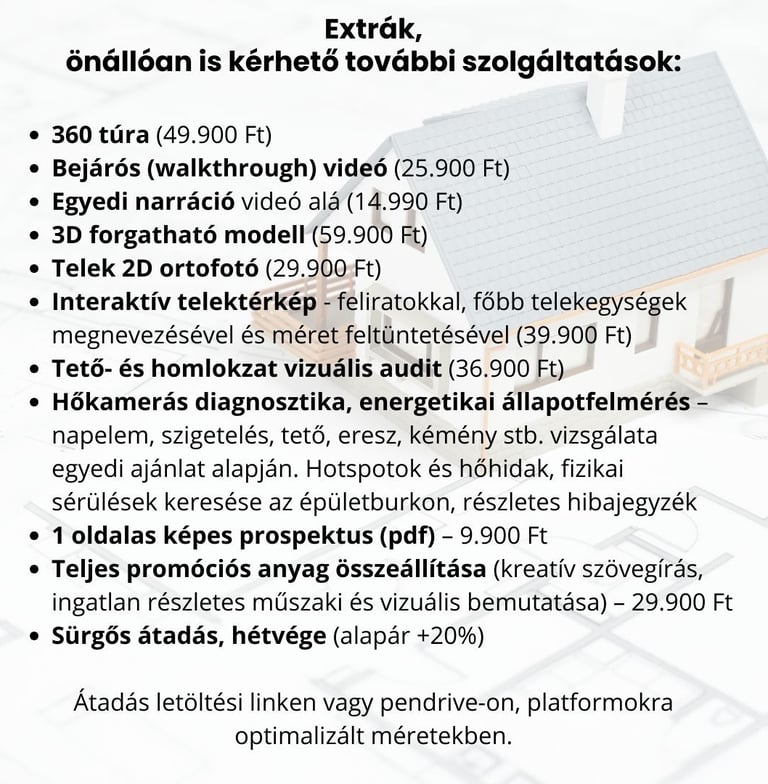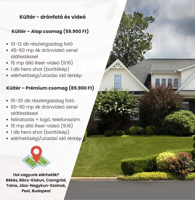 Rövid, érthető történet. Egy 45–60 mp-es drónos összefoglalóban kívül-belül megmutatjuk a lényeget: ház → kert → utcakapcsolat → környék. A vevő képben van már az első üzenetváltás előtt